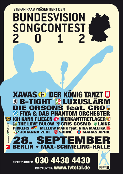 Karten für den "Bundesvision Song Contest" sind unter Ticket-Hotline 030/4430 4430 oder auf www.tvtotal.de (VVK-Start 23:20 Uhr) erhältlich.